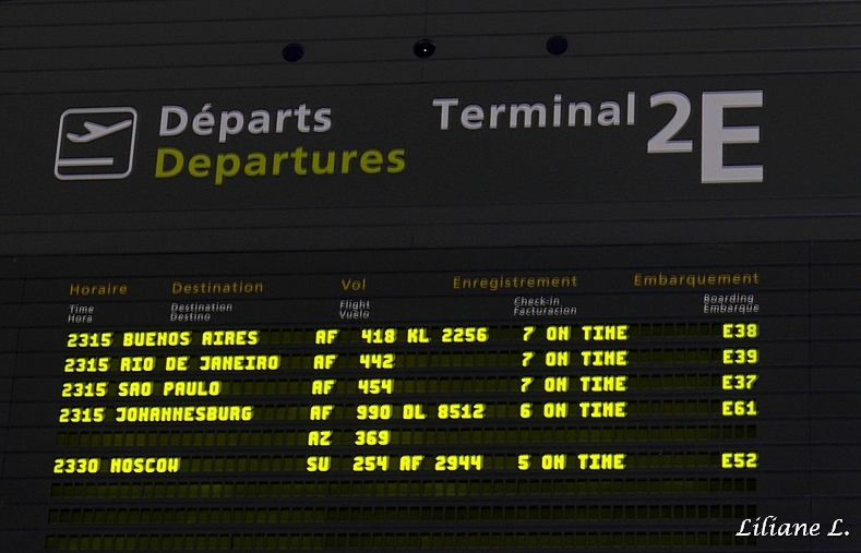 Ce jour que nous attendons depuis longtemps est enfin arrivé. Pascal nous emmène Roissy Charles de Gaulle direction Ushuaia via Buenos Aires. Notre avion décolle à 23 h 15 mn et nous devons être à l’enregistrement 3h avant le décollage. Craignant les embouteillages habituels sur l’autoroute A 13 et le boulevard périphérique, nous partons de la maison suffisamment en avance. Finalement nous ne mettons qu’1 h 30 mn pour arriver à Roissy au Terminal 2E.
