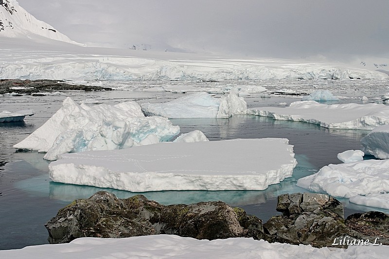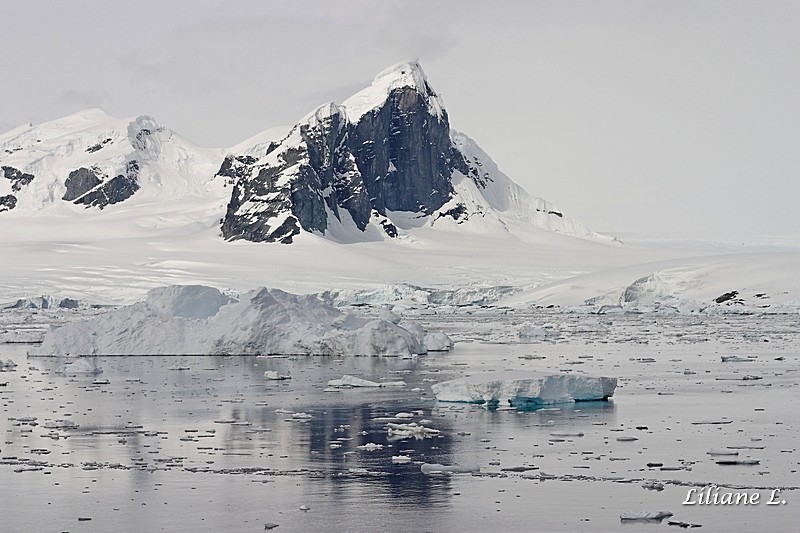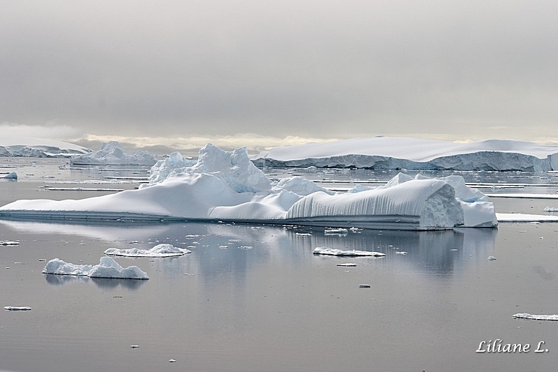 Le temps est gris et lumineux . Les icebergs, les glaciers et les montagnes se reflètent dans l’eau c’est superbe.