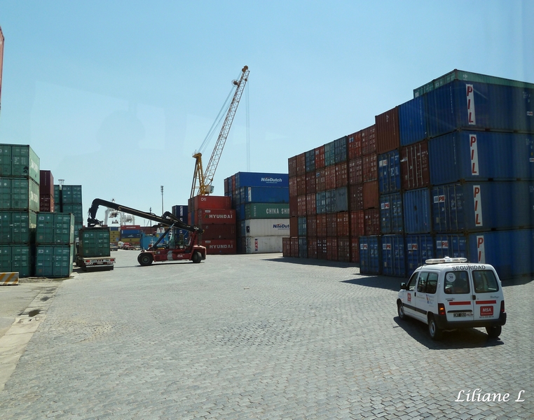 Pour accéder au bateau le car suit la voiture pilote qui se faufile entre des centaines de containers.