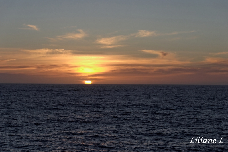 Ce matin je suis réveillée de bonne heure, je sors sur le balcon pour contempler cette belle lumière, vers l’avant du bateau, il est 5 h.