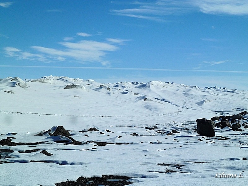 Il fait un temps magnifique, pas de vent, les conditions sont idéales pour faire cette excursion, nous sommes chanceux. Nous voilà partis pour 4 heures et 100 km AR de piste. Nous nous arrêtons à différents endroits pour admirer le paysage et/ou faire des photos. Le chauffeur roule doucement sur la piste mais ça saute quand même un peu.