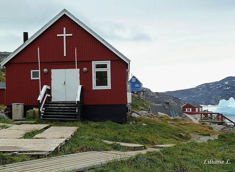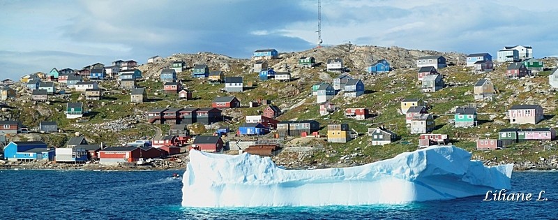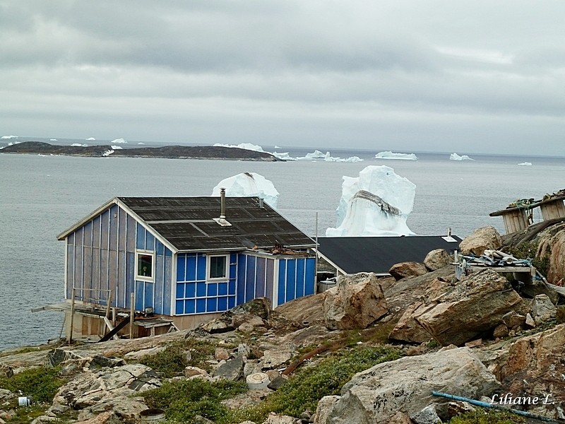Bien que le temps soit plutôt gris j’aime beaucoup la vue sur les montagnes et la baie ou des petits icebergs flottent ici ou là.