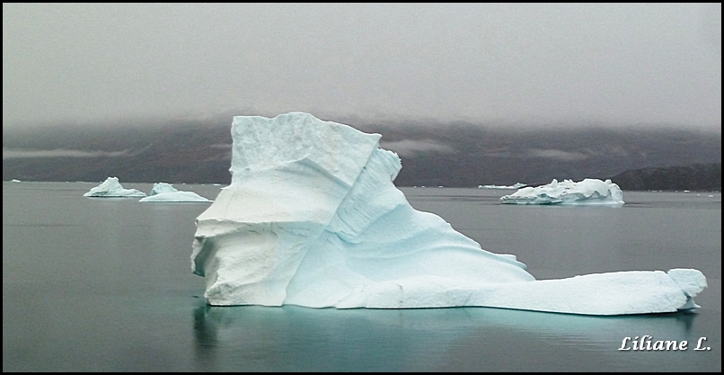 Vers 6h30 , le temps est très gris, il y a du brouillard et quelques flocons de neige. je sors sur le pont admirer les icebergs, je l’ai déjà dis mais j’aime les icebergs!