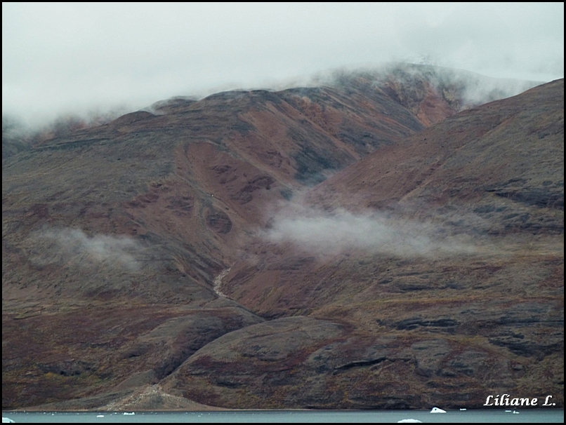 L’Ile de Storo défile sur bâbord tandis que sur tribord une formation géologique capte toute notre attention. De véritables canyons de conglomérats se dressent sur plus de 500m. Il s’agit de roches datant du Dévonien, formé il y a quelques 400 millions d’années. Très belle navigation, les couleurs des roches sont magnifiques, et les icebergs aussi! Dommage que le temps ne soit pas lumineux car les couleurs des roches ressortiraient mieux. Aller je me lâche sur les photos.