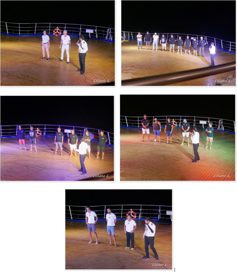 La Manager de l’hôtellerie présente les membres de son équipe puis le Commandant. Le Commandant à son tour présente les membres d’équipage.