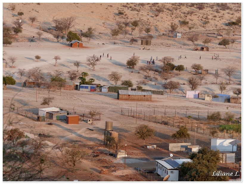 Nous arrivons au village. Le peuple Himba est l’un des derniers peuples à vivre encore de façon ancestrale. Les Himbas sont des pasteurs semi-nomades. Ils vivent du lait de leurs chèvres, de leur bétail ainsi que de diverses plantes. Leur habitat est simple. Ce sont des structures facilement démontables, faites de branchages et de feuilles de palmiers rendues étanches avec la bouse du bétail.