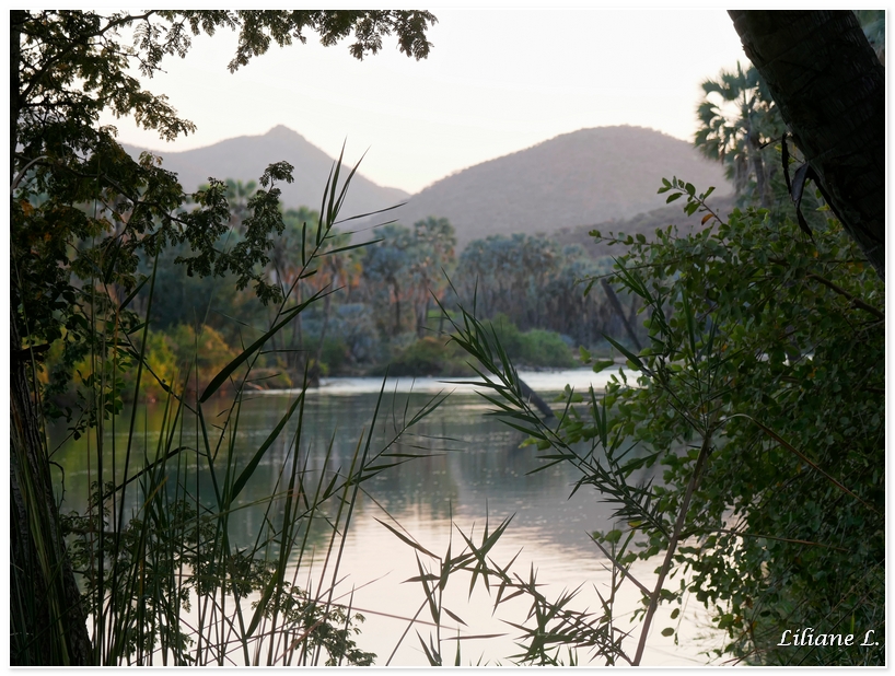 Le soleil donne quelques signes de déclin. Nous allons à pieds aux chutes d’Epupa, nous avons une vue différente de celles-ci par rapport à cette après-midi. La lumière commence à être très belle, les appareils photos crépitent.