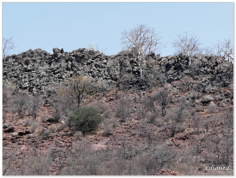 Nous passons à côté de la montagne sacré où les Himbas collectent l’hématie pour en faire leur fameuse poudre ocre rouge, on la trouve au pied des arbres blancs.