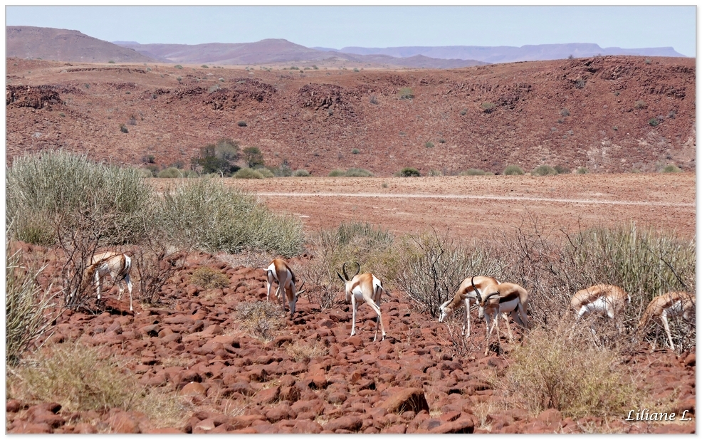 Ce matin nous faisons un safari 4×4 sur la concession de Palmwag, l’une des plus grandes concessions privées d’Afrique Australe en zone ouverte. Aucune clôture ne délimite la propriété, ici les prédateurs circulent librement. Pas de points d’eau non plus, seulement des résurgences. Dans cet environnement minéral et aride, nous observons des espèces similaires à Etosha, mais uniquement les plus adaptées et les moins dépendantes en eau (springboks, oryx, etc.) Côté végétation, beaucoup d’euphorbes damarana, euphorbes virosa.