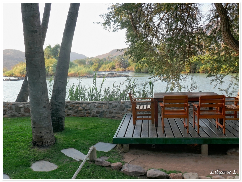 Dîner et nuit au Omarunga Lodge à Epupa. Il est situé au bord du fleuve Kunene à l’ombre des palmiers makalanis. Tous les bungalows ont vue sur le fleuve. C’est un site superbe !