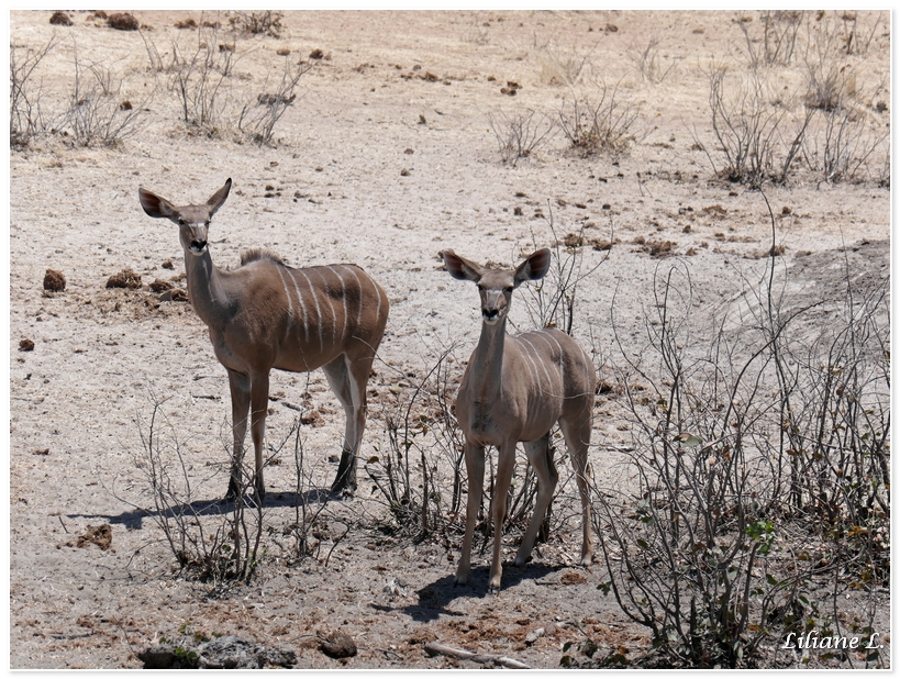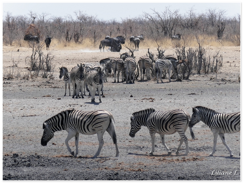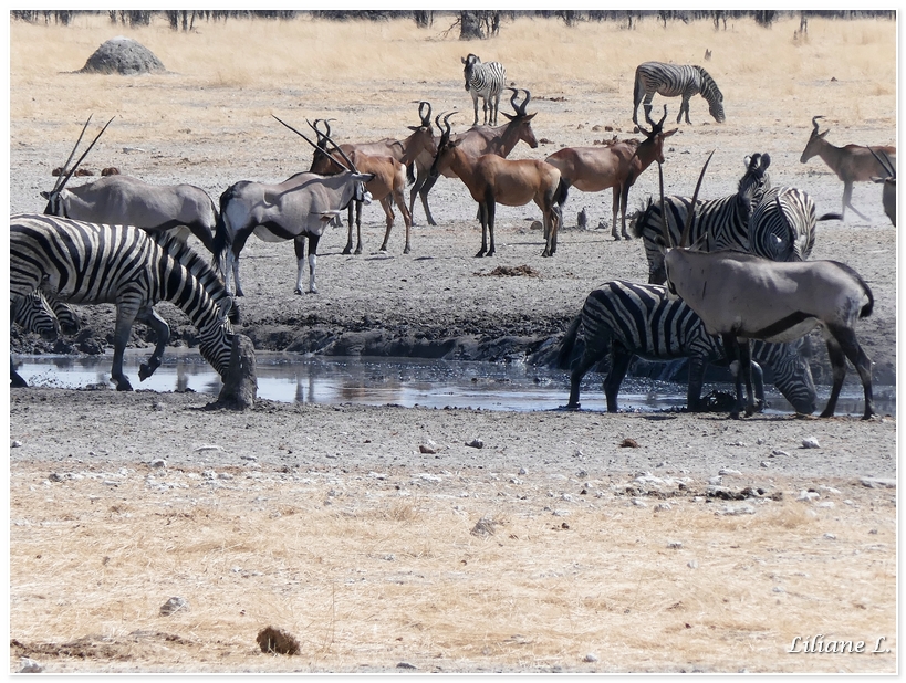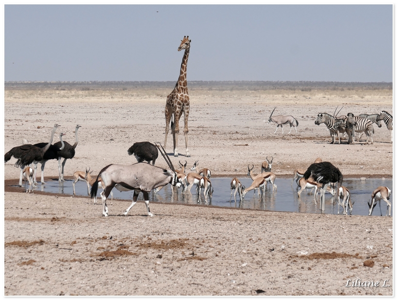 A un autre point d’eau, on voit encore des zèbres, bubales, oryx, girafes, autruches, etc. Il n’est pas très grand mais tout le monde fait bon ménage.