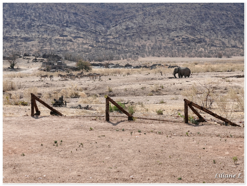En attendant les clés je vais sur la terrasse, quelques zèbres, impalas, Kudus, éléphant, oiseaux, etc , sont en vue, des fils électriques et un fossé nous séparent d’eux.