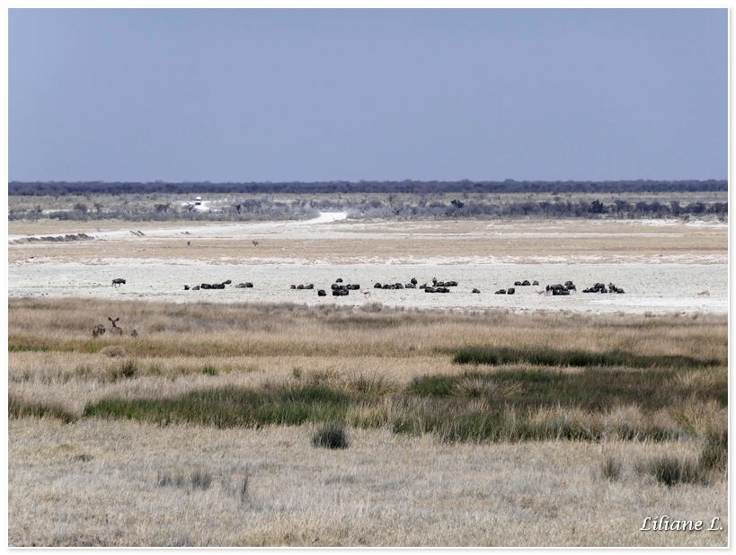 A springbokfontein des gnous bleus se reposent à proximité d’une zone boueuse et humide. Au loin, très loin 5 éléphants se dirigent dans notre direction, nous patientons pour les voir de plus près.