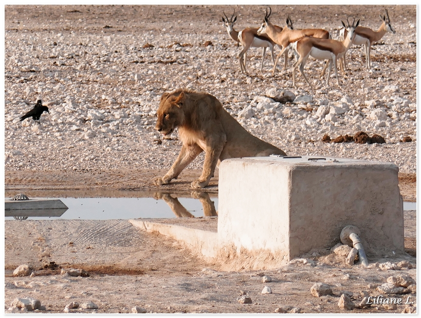 puis allons reprendre notre poste d’observation près des deux lions couchés au point d’eau. Il y a aussi des springboks, oryx, chacals