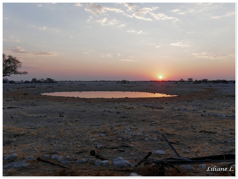 Après-celui-ci Michel et moi retournons au point d’eau, il n’y a pas d’animaux pour le moment mais un beau coucher de soleil.