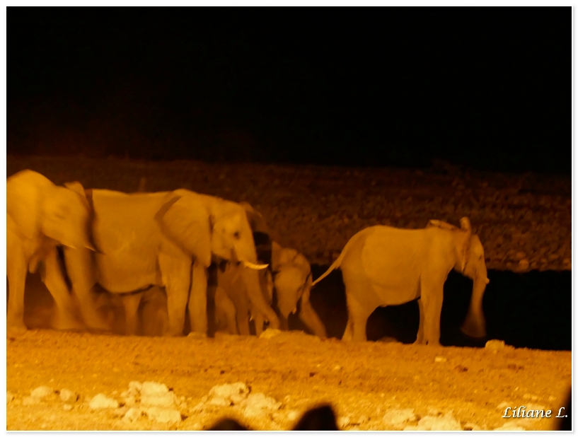 Nous attendons un moment mais aucun animal en vue, Michel décide de retourner à notre bungalow. Notre bungalow n’est pas très loin je raccompagne Michel à celui-ci car nous n’avons qu’une lampe et il fait maintenant nuit noire, puis je reviens toute seule au point d’eau. Mes compagnons de voyage sont également partis se coucher.