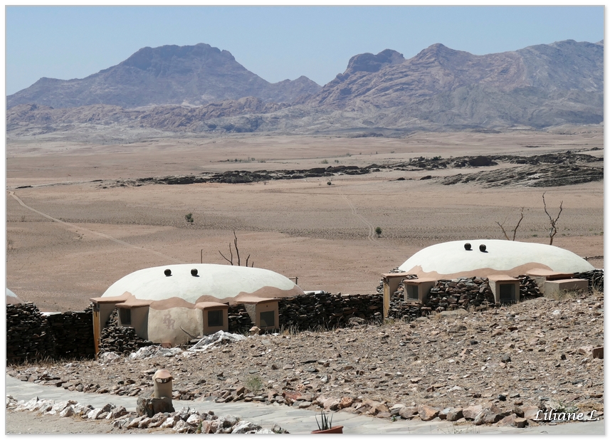 Il est 14h, une petite faim se fait sentir, ça tombe bien un portique en bord de piste nous invite pour le déjeuner : le Rockstock Ritz. Il est situé au milieu de nulle part. Entre les cordons des dunes de sable rouge et les montagnes de l’escarpement du Namib, le Rockstock est une étape au confort inattendu au milieu de toute cette aridité. Il offre une superbe vue sur le Namib. Bon repas.