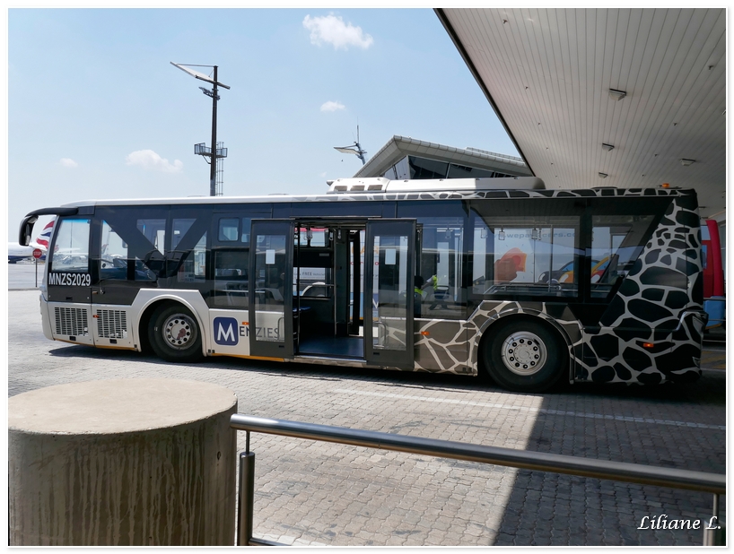 Pour rejoindre notre avion nous empruntons une navette. Je trouve la décoration du bus amusante, elle nous met tout de suite dans le bain.