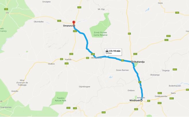 Il y a du monde pour passer les formalités, pour mes compagnons de voyage c’est rapide, mais pour moi c’est plus long, je ne sais pas pourquoi, enfin il tamponne mon passeport, ouf je peux rejoindre les autres. A la sortie de l’aéroport les 2 dernières personnes du groupe nous attendent ainsi que nos 2 Chauffeurs –Guides Blandine et Rédemptus. Tout le monde se présente et nous montons dans les 2 4×4 direction Omaruru. Nous sommes 6 par véhicule.