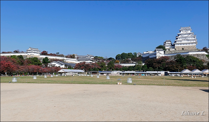 C’est à mi-chemin entre Kobé et Okayama . Il est inscrit au Patrimoine Culturel Mondial, Trésor National, Site historique spécial. On ne voit que lui en arrivant en train, il dépasse majestueusement d’un parc touffu au bout de la large artère Otemae-dôri qui le sépare de la gare.