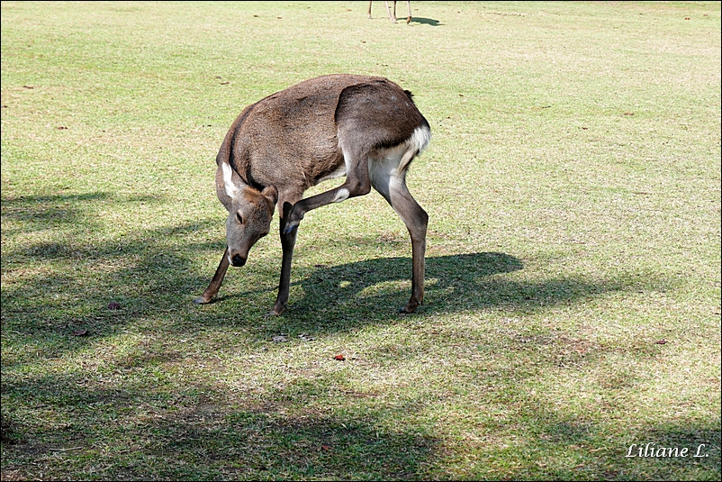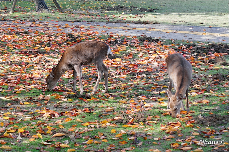 Le parc de Nara (Nara-Koen) a été crée en 1880, il étale de vastes pelouses entrecoupées d’étangs, de bosquets et de quelques avenues au pied d’une colline en pente douce nommée Wakakusa. Vénérés depuis les temps anciens comme les messagers des Kami (dieu shinto) de hardes de daims et biches y vadrouilles en liberté. La plupart des visiteurs les nourissent de petites galettes appelées shika-sembei.