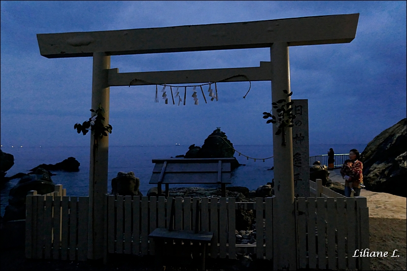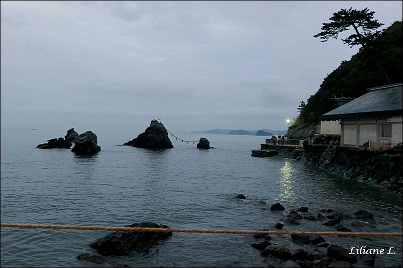 Ce sont deux rochers un gros et un petit reliés par une corde tendue : la shimenawa, tressée à partir de paille de riz. Elle délimite habituellement un espace sacré qui doit être tenu à l’écart de l’impureté, et on la trouve parfois placée autour d’un arbre ou d’un rocher dans un sanctuaire, signifiant que l’élément végétal ou minéral est la demeure d’un kami (dieu). On y pend souvent des gohei (bandes de papier blanc plié en éclair).