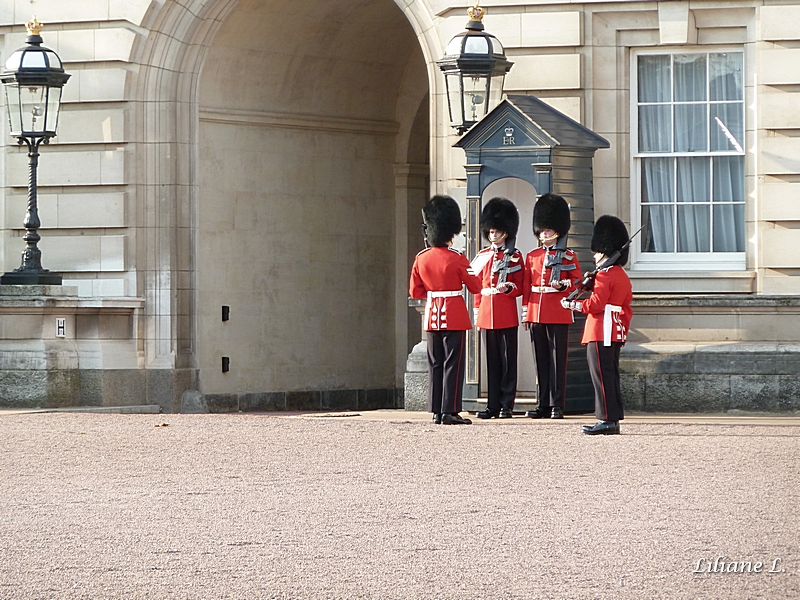 Nous arrivons enfin à Buckingham Palace. Il n’y a pas trop de monde. Aujourd’hui il n’y a pas de cérémonie de relève de la garde, simplement un changement de personnes.
