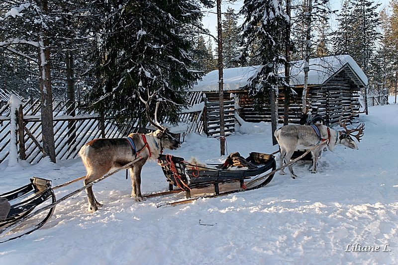 La jeune femme qui nous reçoit est très accueillante, Elle nous emmène auprès des rennes qui sont déjà attelés pour notre balade, peu après son mari, guide, arrive. Nous nous installons chacun dans un traineau, on nous donne une couverture et c’est parti pour une promenade d’une heure. Il fait très beau et il n’y a pas de vent. C’est très agréable de se laisser aller, à part le bruit des sabots des rennes sur la piste et le crissement des traineaux sur la neige pas un bruit, les paysages sont magnifiques.