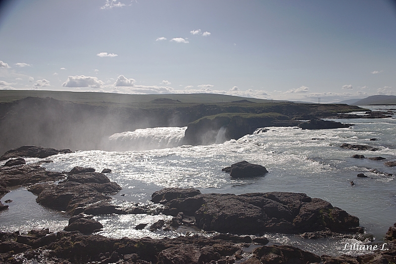 Après le bon petit déjeuner copieux et varié que nous prenons à la guesthouse, nous partons pour Godafoss , la « Chute des Dieux ». Superbe chute très puissante, de 12 m de haut et 30 m de large, nous passons un bon moment à la regarder. Il y a pas mal de monde.