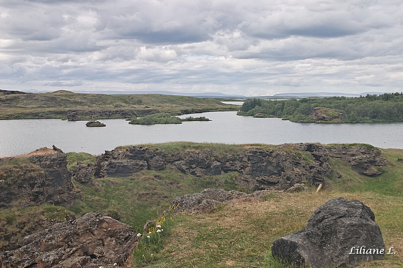 Le promontoire boisé d’Höfdï a été aménagé en réserve naturelle afin de préserver son atmosphère féerique. Nous nous baladons parmi les petites fleurs sauvages et les bouleaux nains, il faut dire que les arbres sont rares en Islande. Durant cette balade nous avons de très belles vues sur le lac.