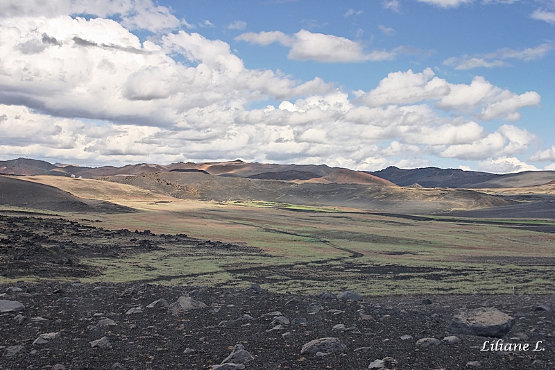 A quelques kilomètres de là, se dresse le cratère d’explosion Hverfjall, pour y accéder il faut prendre une petite piste en tôle ondulée. Il y a pas mal de voitures sur le parking. Nous prenons le sentier abrupt tracé dans les scories qui permet d’arriver au sommet, il est possible d’en faire le tour, nous n’en ferons qu’une petite partie car nous n’avons pas le temps de le faire en entier.