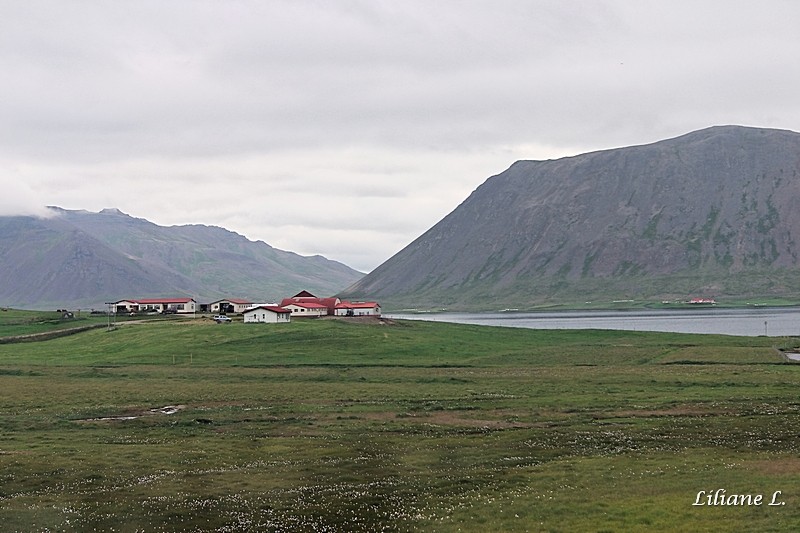 Peu avant Budarldalur, nous prenons la route 59 qui traverse un plateau pour arriver à Bondeyri, et nous longeons le Hrutafjordur jusqu’à Bru où nous rejoignons la route 1.