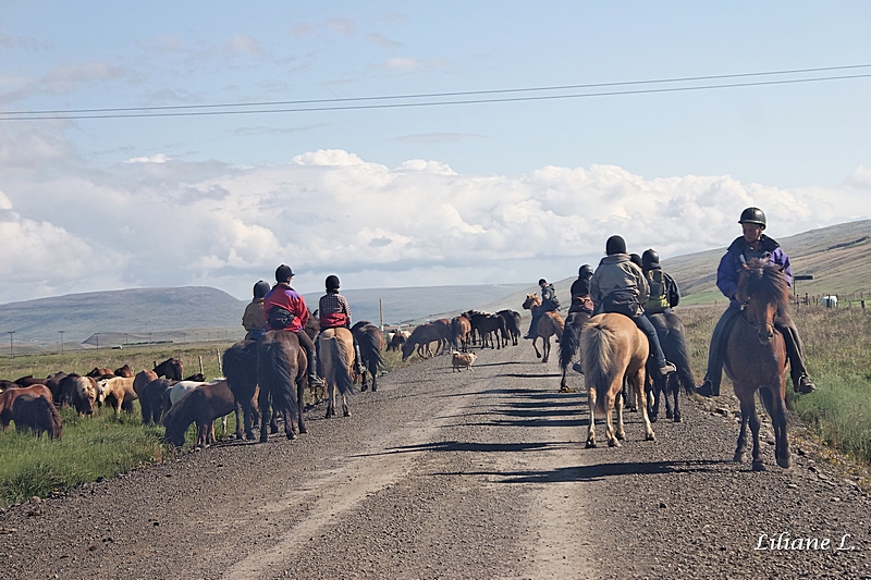 De l’autre côté de la route 1, nous parcourons un bout de la 722, route en terre où nous découvrons les tertres morainiques, vestiges de l’ère glaciaire. C’est là aussi qu’eut lieu en 1720, le plus grand glissement de terrain de l’Islande. Sur cette route nous croisons beaucoup de cavaliers et de chevaux.