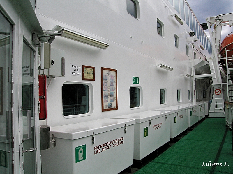 Le MS/Polarlys est un beau bateau construit en 1996, il y a 216 cabines, 6 suites, 737 passagers et 45 places pour les véhicules. Nous sommes au pont 5, cabine extérieure, nous avons un sabord, elle n’est pas très grande, mais confortable. De notre cabine il n’y a que quelques pas à faire pour aller sur le pont.