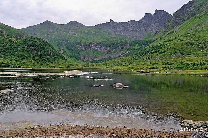 Sur la route entre Eggum et Straum, sur ce lac, nous apercevons un oiseau les ailes toutes déployées, Il est très amusant à regarder car il se tourne d’un côté puis de l’autre, les ailes toujours déployées.