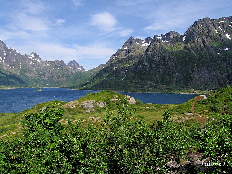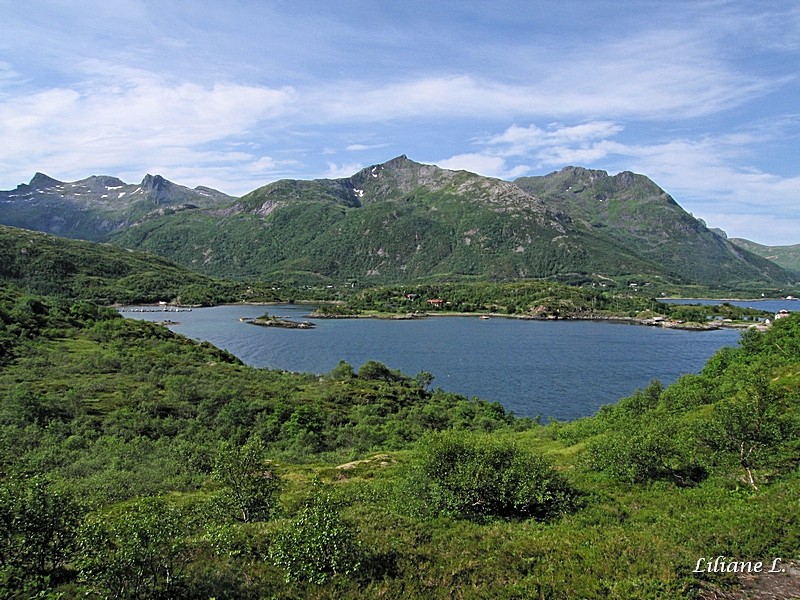 Nous nous arrêtons quelques kilomètres plus loin à Austnesfjord et empruntons le sentier qui monte à un point de vue, c’est superbe.