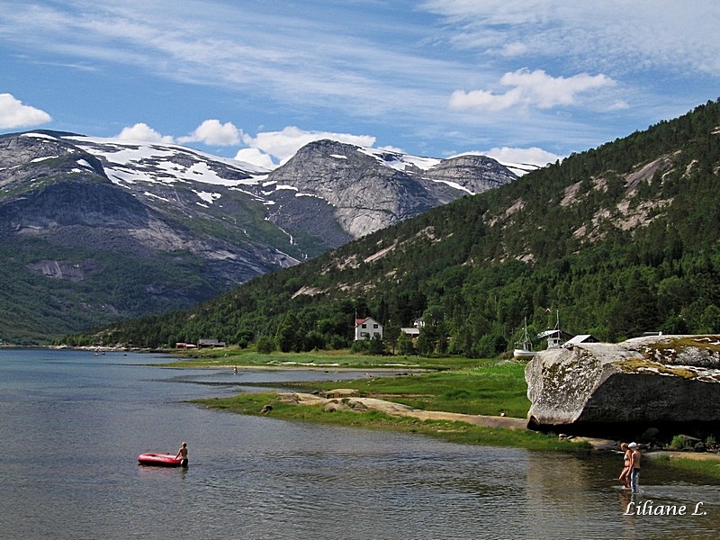 Arrêt à Morsvikbotn, il fait beau et chaud à nouveau. Nous mangeons une glace sur la terrasse du café. Quelques personnes se baignent dans le Morsvikfjorden.