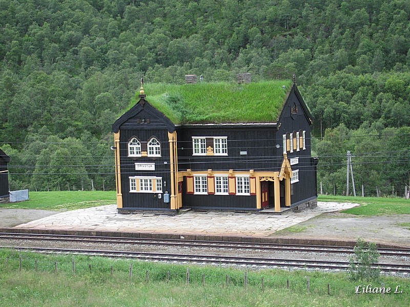 A Drivstua jolie petite gare,au milieu de nulle part on dirait une maquette. C’est la ligne de chemin de fer Oslo/Tromdheim. Puis nous traversons le Drovefjell Nasjional Park, c’est un plateau où pousse de la mousse, des lichens des petites fleurs et arbustes nains.
