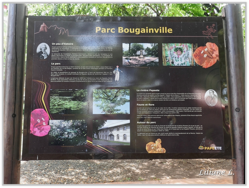 Nous nous baladons un petit moment dans ce parc Bougainville qui est ombragé. La rivière Papeete serpente dans ce parc et prend sa source derrière l’Assemblée de la Polynésie Française. Sur la rivière on voit de grandes feuilles de lotus je crois  avec quelques fleurs qui pointent leur nez.