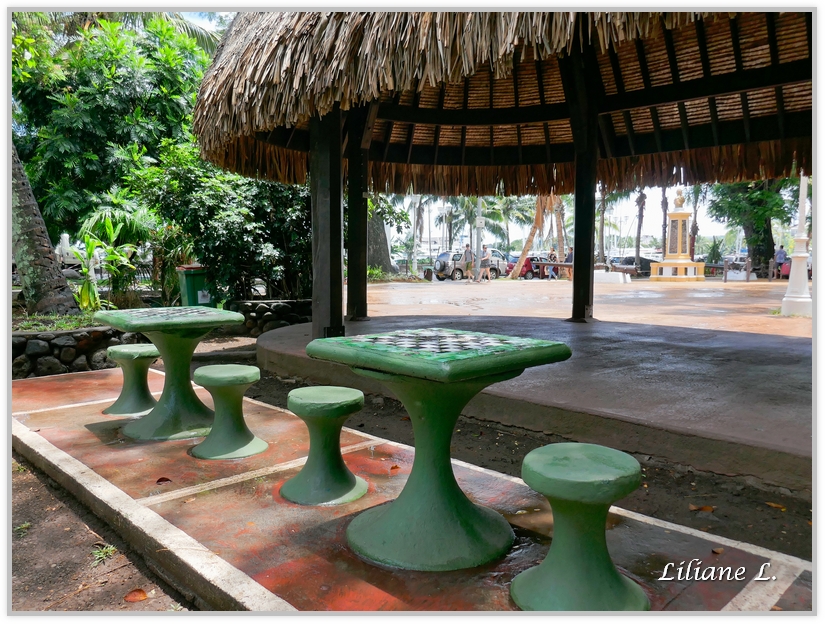 Nous nous posons un moment sur un banc à l’ombre près des tables de jeux de dames. Au bout d’un moment deux personnes viennent s’installer près de nous, sortent leurs pions pour jouer, mais avant,  le plus âgé des deux entame la conversation, il nous parle, entre autre, de la vie à Papeete,  bon moment de partage.
