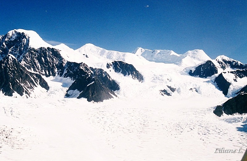 En cours de vol le pilote demande si l’on veut atterrir sur le glacier, tout le monde dit oui, encore une p’tite folie de plus car il y a un supplément . Il nous dépose sur le glacier face au Mont Kinley c’est grandiose! Quelle vue nous en avons le souffle coupé.