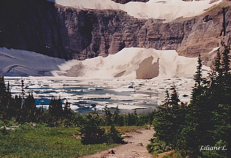 Comme prévu nous allons à Iceberg Lake. Il paraît qu’il y a beaucoup d’ours dans la région. Il faut faire attention à ne pas en surprendre au détour d’un chemin. Il y a un autre inconvénient, les petites bêtes qui viennent voler autour de nous et piquer, bien entendu nous n’avions pas pris de répulsif. Des Américains qui étaient près de nous, nous voyant nous bagarrer avec les moustiques, nous ont prêté leur flacon de répulsif pour insectes, c’est vraiment gentil de leur part.