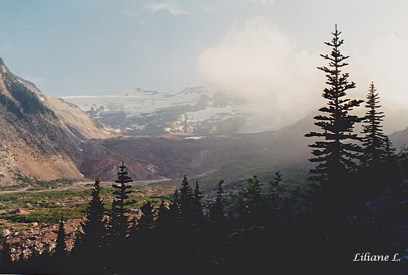 Après celui-ci nous ressortons et prenons le Emmons Trail 3 km 200, qui nous mène sur la moraine du glacier du même nom. Il est bordé de framboisiers en fleurs, les feuilles et les fleurs sont très grosses, je n’en n’ai jamais vu de comme ça. En arrivant à la moraine, le temps s’est un peu éclairci et nous avons une belle vue sur le glacier Emmons,
