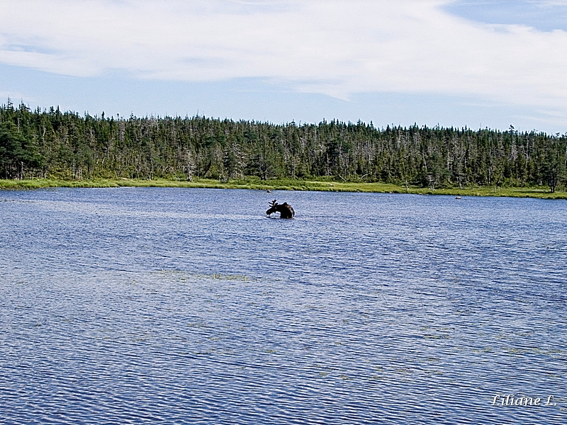 Sur le sentier des Québécois nous disent avoir vu 3 orignaux dans le lac, deux viennent de partir mais que nous ne sommes pas loin, nous les remercions pour ces informations et accélérons le pas en espérant que le dernier soit encore là. Oh ! quelle chance il est encore là au milieu du lac, nous nous asseyons sur le banc et l’observons un bon moment.
