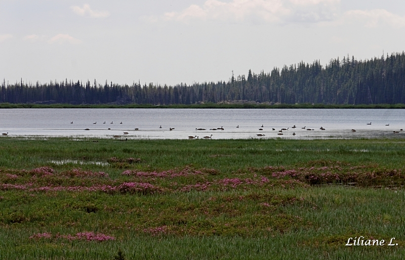 Elk Lake beau lac sur lequel il y a des oies sauvages, mais elles sont loin, les rives sont couvertes cyclamens roses au bord de celui-ci, c’est très joli.