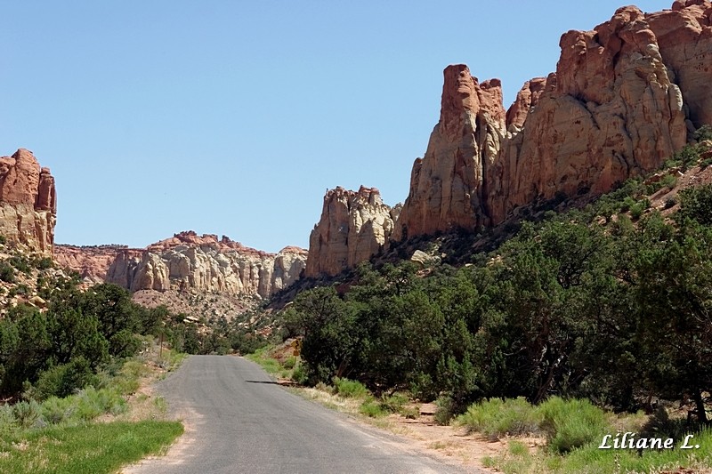 A Boulder nous empruntons la fameuse Burr trail 120 km AR de route goudronnée (jusqu’à Long Canyon) ensuite c’est une piste. Nous ne parcourrons que la partie goudronnée, qui descend en lacets au fond du canyon, c’est une superbe route bordée de magnifiques et très hautes falaises rouges, on s’arrête à tout bout de champ pour admirer le paysage et arrivés à la fin de la route waouh quelle vue !