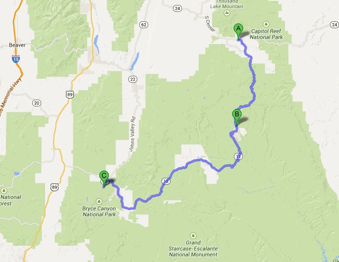 Après un solide et bon petit déjeuner toujours pris en compagnie de nos hôtes, nous prenons la direction de Bryce Canyon par la scenic bway 12. Très belle route de montagne dont la première partie est verdoyante puis plus désertique, mais tout aussi belle. Il y a de magnifiques points de vue.