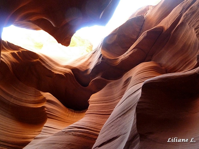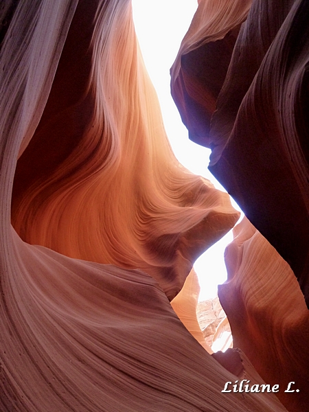 Ce matin nous allons à Lower Antelope Canyon. A la guérite un groupe de 5 personnes attend pour la visite, nous prenons nos tickets et le guide indien donne le signal du départ, nous ne sommes que 7, super ! Nous descendons dans le canyon par un passage très étroit, je me demande si je vais passer la dedans, mais oui sans problème.